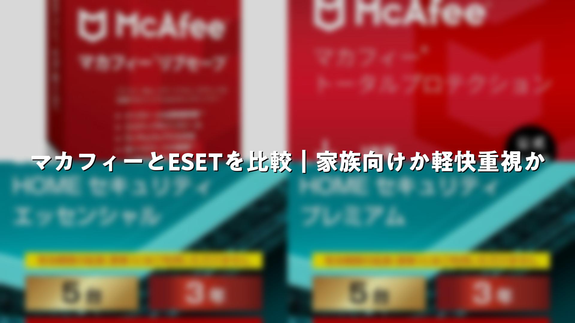 Amazonレビューを参考にすると、マカフィーは「家族シェア便利」、ESETは「PC速いまま」との違いが明確。自分のライフスタイルにマッチする方を。
