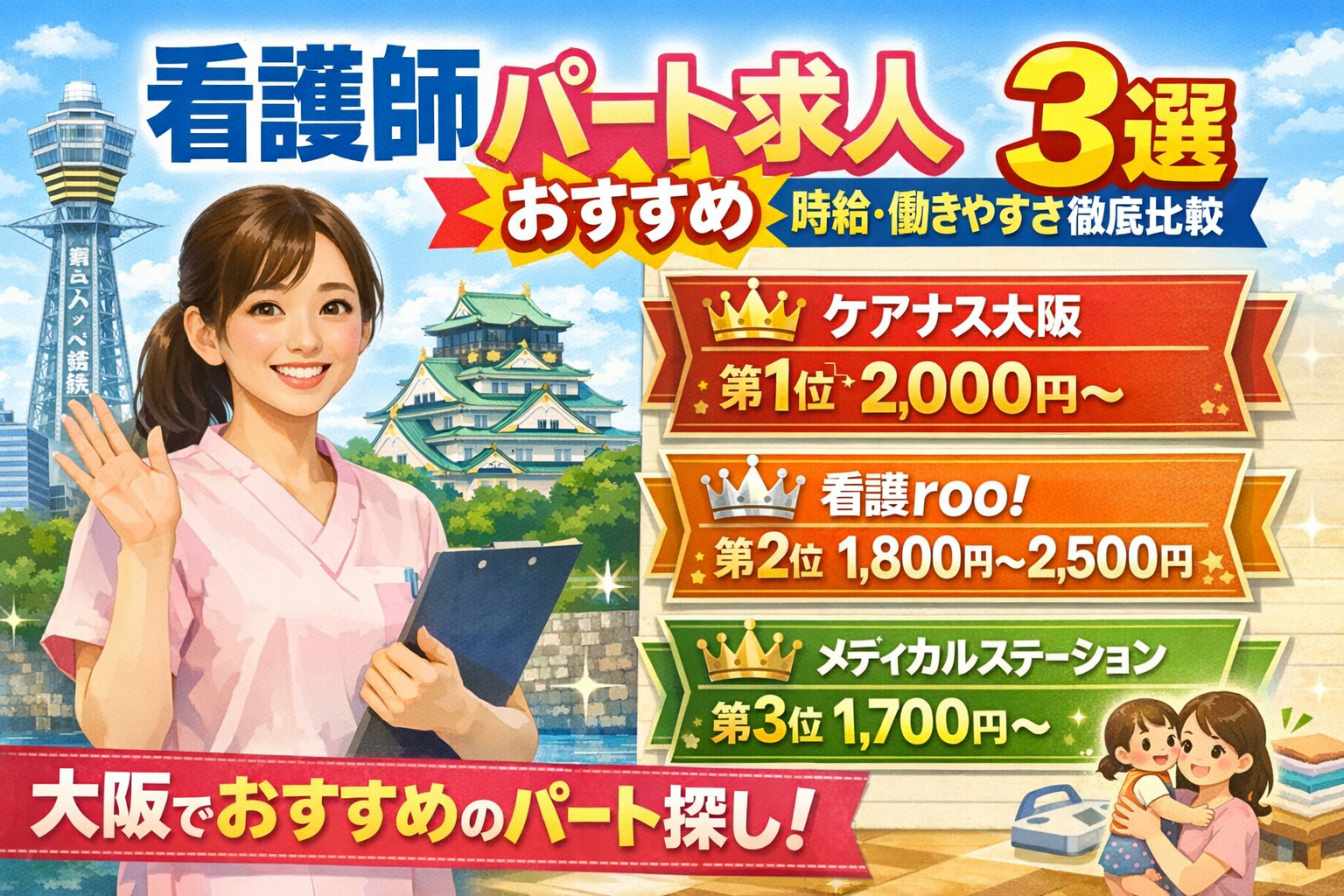 子育てや家事と両立しながら看護師として働きたいけど、時間や条件に合うパート求人が見つからない…そんな悩みを抱える女性は多いですよね。この記事では、大阪エリアに特化したおすすめ求人サービスをランキング形式で紹介。時給高めで働きやすいものを厳選し、あなたのライフスタイルに合った仕事探しをサポートします。