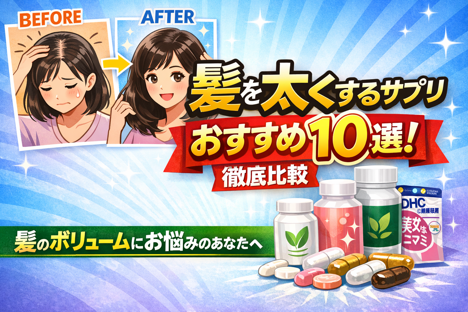 髪の毛が細くボリュームがなくなってきて、分け目やテッペンが目立つとお悩みの方は多いですよね。特に30代~50代の女性で産後や加齢によるスカスカ感に悩む人も少なくありません。この記事では、髪の毛を太くするサプリの選び方からおすすめ商品を徹底比較し、あなたにぴったりのものを提案します。
